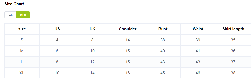 | Size | US | UK | Shoulder | Bust | Waist | Skirt length |