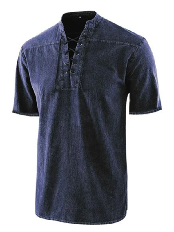 Men’s Woven Retro Lace Up Collar Casual Short Sleeve Shirt