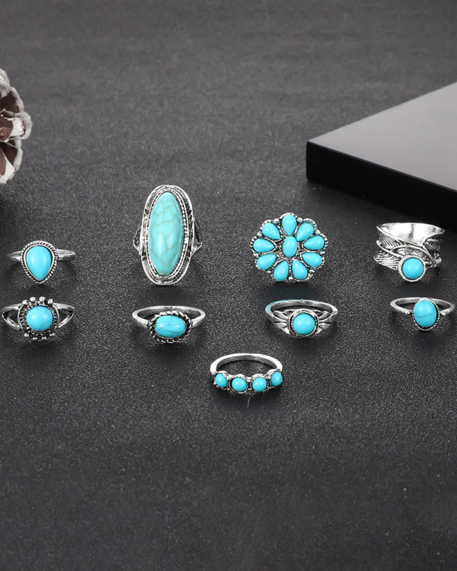 New Ring Retro Bohemian Feather Turquoise Hollow 9-piece Set