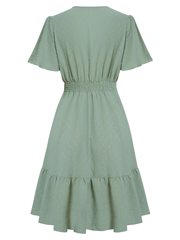 Women’s lace stitching V-neck solid color ruffled sleeve dress, fashionable in style, soft and comfortable fabric. It can be worn daily, going out, dating, vacation, etc. Washing method can be machine wash or hand wash. Fabric is wrinkle and pill resistant. The size is measured by hand, and it is normal for there to be an error of 1-3cm.